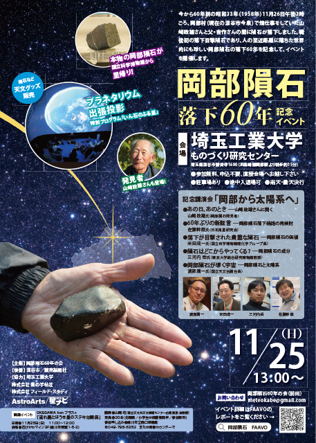 会場となる埼玉工業大学では、ほかにもエアドーム式のデジタルプラネタリウムで特別番組「いん石のふる里」の投影や、天文グッズ・隕石の販売を行います。開催は落下60年の1日前となる11月25日(日)。三連休の最終日、どうぞお誘い合わせのうえお出かけください。