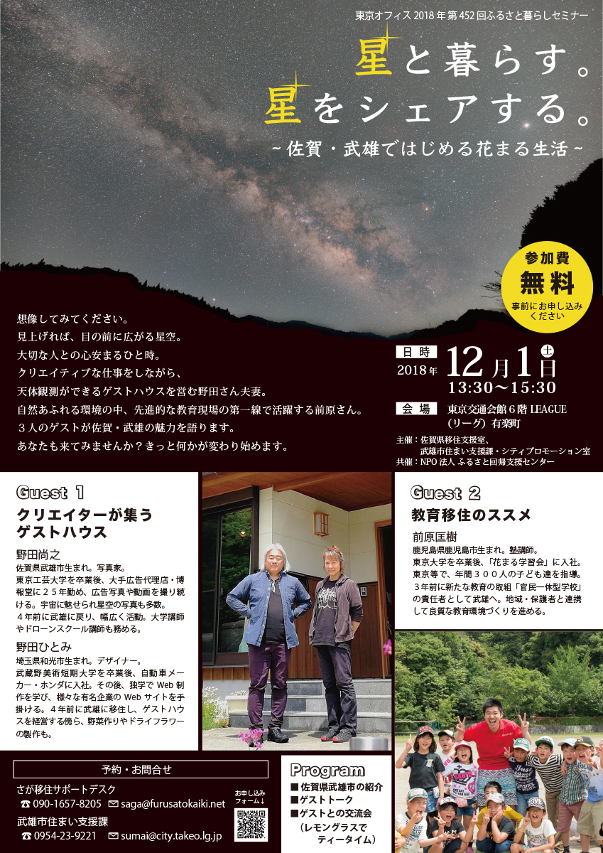 12月1日(土)午後、東京・有楽町で「星と暮らす。星をシェアする~佐賀・武雄ではじめる花まる生活~」セミナーが開催される。