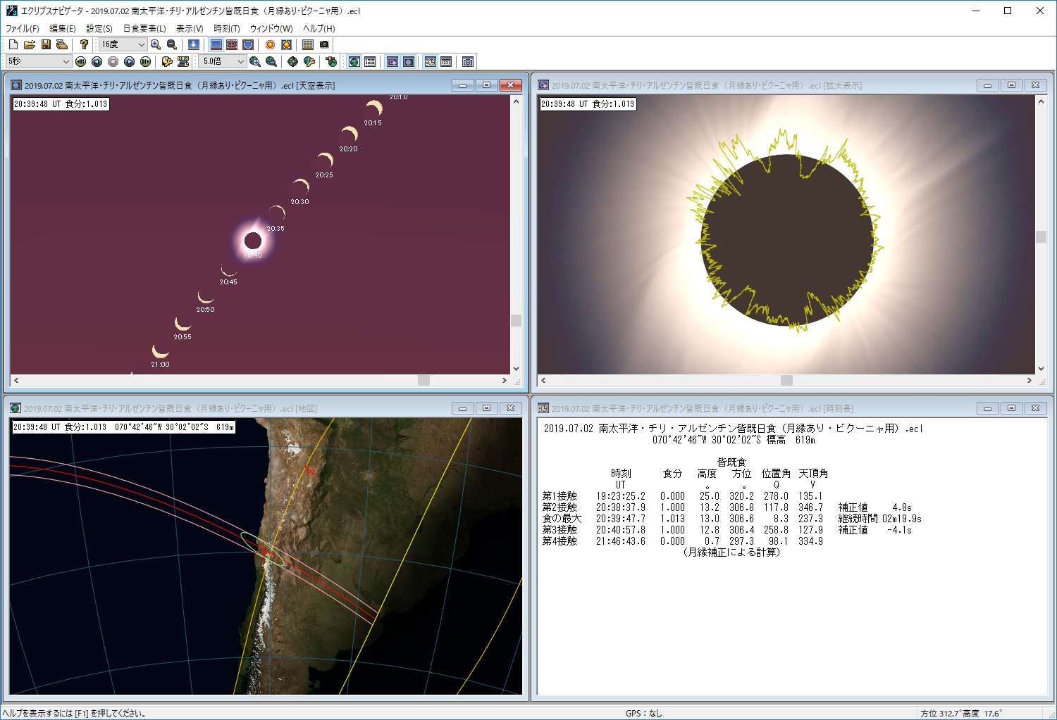 チリ・ビクーニャでのシミュレーション。日食帯地図や時刻表、天空表示、連続表示など、多角的に日食現象をシミュレーションできる。画像クリックで表示拡大