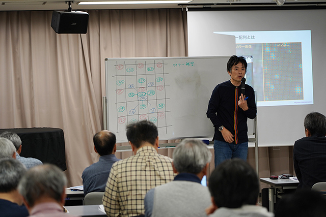 4月20日(土)の午後に行った第1回「画像処理概論」は、本講座の特長でもある画像処理の“理屈”を学ぶという内容です。デジタルカメラのRAW画像の特徴、ビット深度と階調、階調とヒストグラム、ホットピクセルとダーク減算、ランダムノイズとコンポジット、フラット補正、フラットデータの作り方など、画像処理を行う上に知っておくべきことを図版を使って紹介し、画像処理の全体の流れなども解説しました。