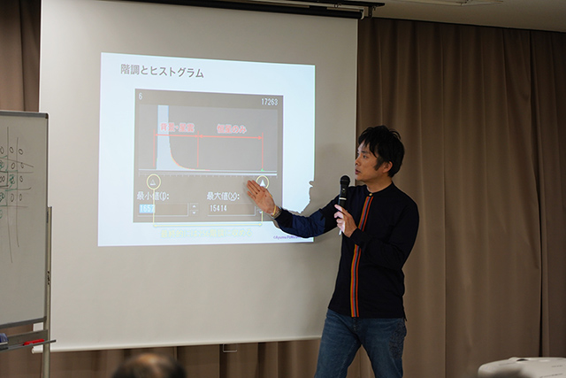 翌21日(日)の第2回「ステライメージ8を使った基本処理」では、最初に前日の講座の復習をしてから、「ステライメージ8」の詳細編集モードでのキャリブレーション、RAW現像、コンポジット(スタッキング)、階調の調整、色調の調整など各処理のポイント、階調処理でのトーンカーブの使い方、テクニックを学習しました。講座の開始時間は午前10時30分でしたが15分前には受講者全員が揃うほど熱心で、とくに階調処理でのトーンカーブの使い方のコツはこれまでの講座と同じように今回も大好評でした。