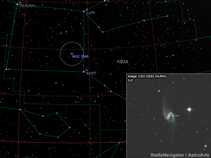 NGC 7549周辺の星図と、DSS画像に表示した超新星。画像クリックで星図拡大(「ステラナビゲータ」で星図作成。DSS画像の版権について)