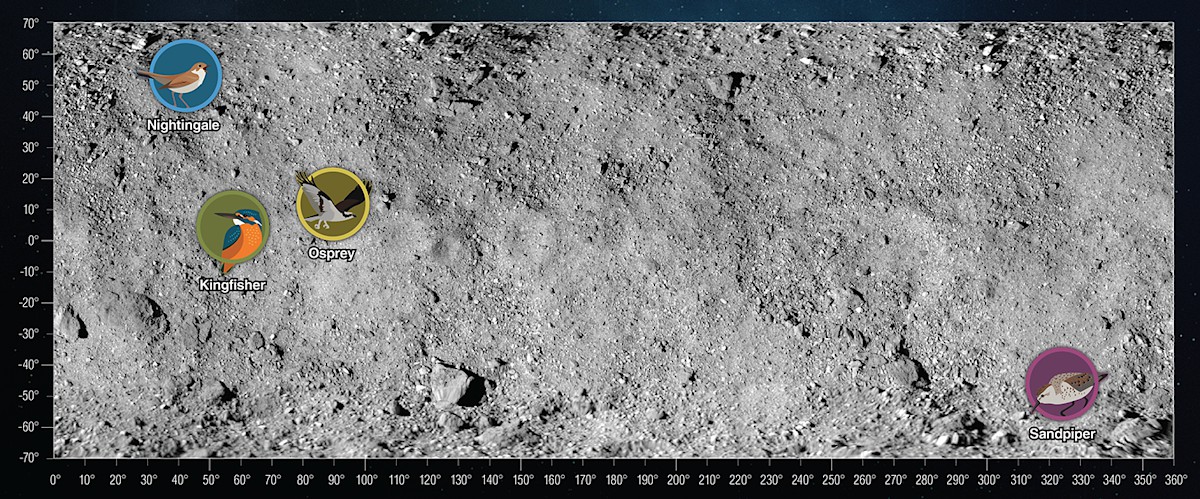 8月に発表されたオシリス・レックスのサンプル採取候補地点4か所の画像。エジプトに生息する鳥の名前から、「ナイチンゲール(サヨナキドリ)」「キングフィッシャー(カワセミ)」「オスプレイ(ミサゴ)」「サンドパイパー(シギ)」と命名されている。今回「ナイチンゲール」がサンプル採取地点、「オスプレイ」が予備の地点に選定された