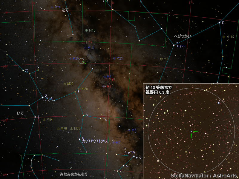 いて座の新星の位置。画像クリックで星図拡大(「ステラナビゲータ」で星図作成)