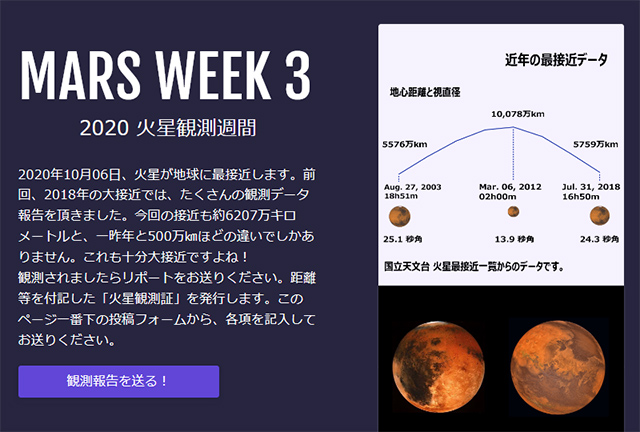 日本惑星協会では、2003年、2018年に続いて今回も「火星観測週間 Mars Week 3」のウェブページを開設し、観測キャンペーンを開始しました。前回同様、ご報告いただいた方々に観測証(PDF)を発行します。