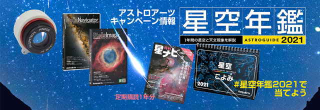 第1弾として、好評発売中の「アストロガイド 星空年鑑 2021」についてつぶやくと、抽選で観望などに役立つプレゼントが当たるキャンペーンを実施いたします。賞品として、手軽に持ち歩けて肉眼では見えない星まで見える「スコープテック×ヒノデ 星座望遠鏡」、星空年鑑のアストロガイドブラウザとも連携する天文シミュレーションソフト「ステラナビゲータ11」、新発売の天体画像処理ソフト「ステライメージ9」、月刊天文雑誌『星ナビ』定期購読1年分、そして2021年の星空情報をカレンダーにまとめた「星空こよみ ASTROGUIDE CALENDAR 2021」をご用意いたしました。