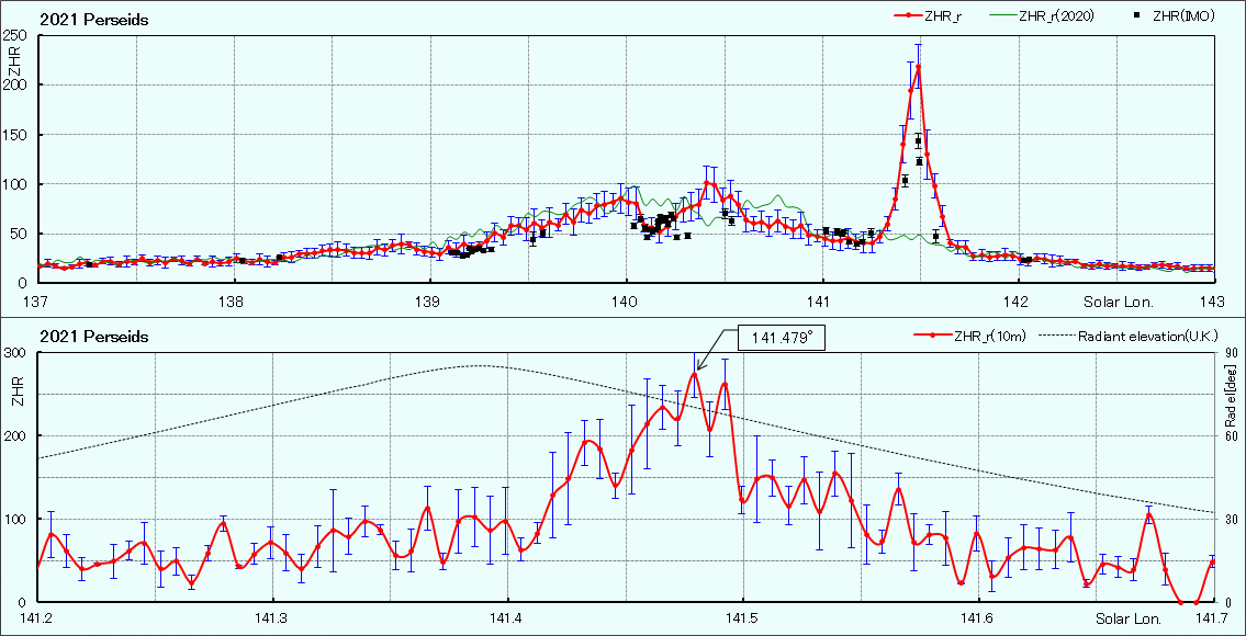 この極大は電波観測でもとらえられていました。世界的に流星電波観測のデータを集計している杉本弘文氏は、通常極大から大きく離れた時間帯に出現数が増加していることにいち早く気付き、日本流星研究会のメーリングリストに投稿しました。筆者も含め、このメールで気付いた日本の観測者や研究者も多かったようです。最終的には10分毎の集計によって、太陽黄経141.479度(14日17時15分)付近で突発出現の極大が起こり、眼視観測のZHRに相当する値は273(±28)にまで達していたことがわかりました。