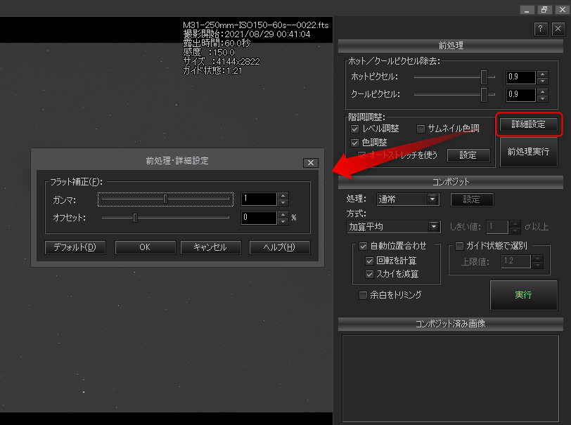自動処理モードの「コンポジットパネル」でフラット補正の「ガンマ」「オフセット」を設定。フラット補正に失敗する場合は、少ない枚数で「ガンマ」「オフセット」の値を確認し設定のうえ最終的な多枚数コンポジットを行うと効率的。画像クリックで表示拡大