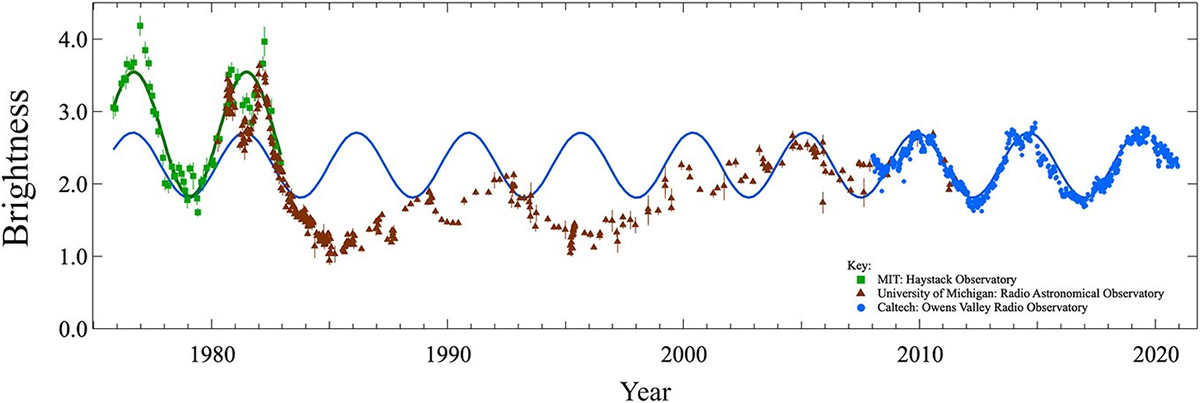 PKS 2131の電波における明るさの45年にわたる変化。(青)オーエンスバレー電波天文台、(茶)ミシガン大学電波天文台、(緑)ヘイスタック天文台。画像クリックで拡大表示(提供:Tony Readhead/Caltech)