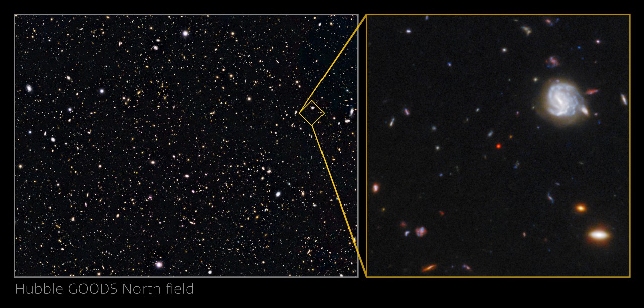 (左)GOODS-Northの写野。広さは10×16分角。(右)今回発見された「GNz7q」(中央の赤い点)。画像クリックで表示拡大(提供:NASA, ESA, Garth Illingworth (UC Santa Cruz), Pascal Oesch (UC Santa Cruz, Yale), Rychard Bouwens (LEI), I. Labbe (LEI), Cosmic Dawn Center/Niels Bohr Institute/University of Copenhagen, Denmark)