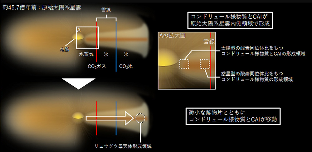 また、コンドリュール様物質に含まれる酸素の同位体の比率を調べたところ、太陽の同位体比に近いもの(太陽型)と、惑星の同位体比に近いもの(惑星型)にはっきり分かれた。前者は太陽の近く、後者は現在の小惑星帯でできたと考えられる。さらに、リュウグウのコンドリュール様物質は太陽系で最も早い時期にできたコンドリュールと様々な特徴がよく似ていることが顕微鏡観察から判明した。