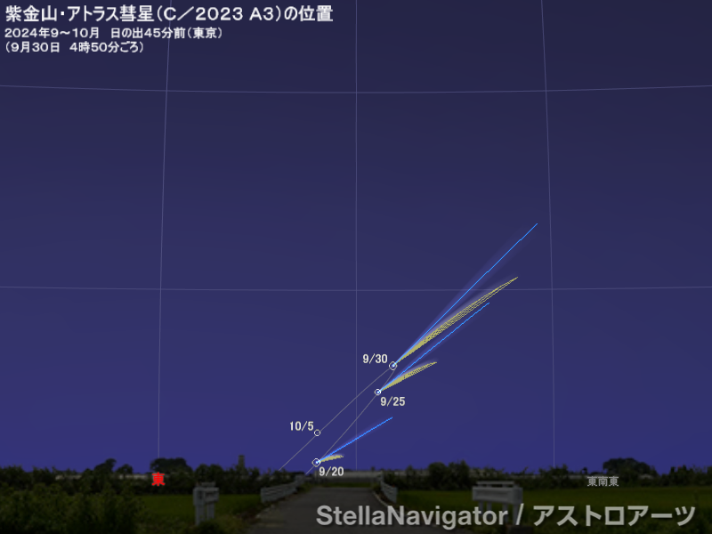 日の出45分前の方位と高度(場所の設定は東京)。彗星は模式的に表現している(10月5日の尾は描画が重なるため略)。画像クリックで表示拡大