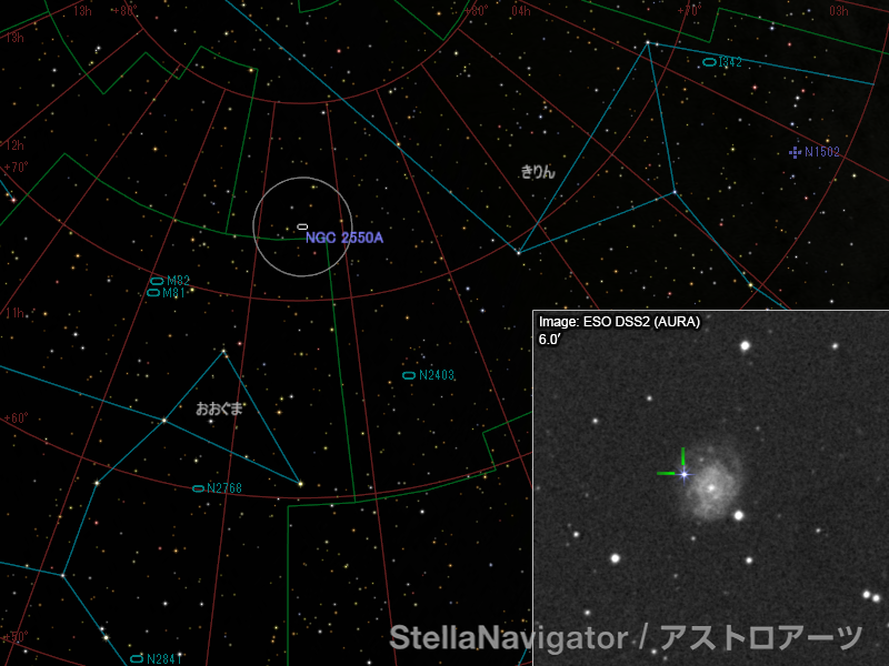 NGC 2550A周辺の星図と、DSS画像に表示した超新星。画像クリックで星図拡大(「ステラナビゲータ」で星図作成。DSS画像の版権について)