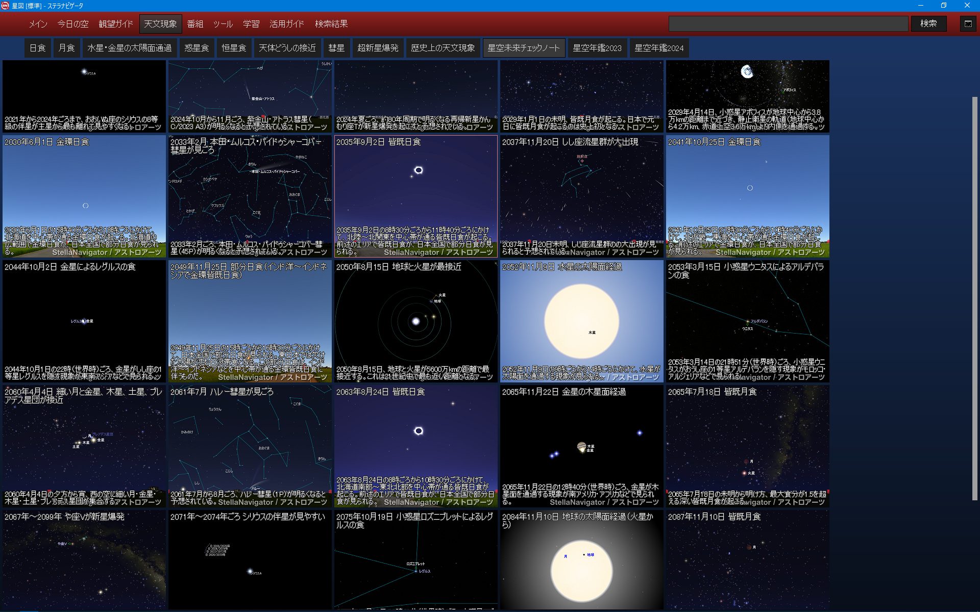 詳しくはステラナビゲータ12「活用しよう」ページをご参照ください。ステラナビゲータと星ナビで、未来のS級天文現象を先取りしてお楽しみください。