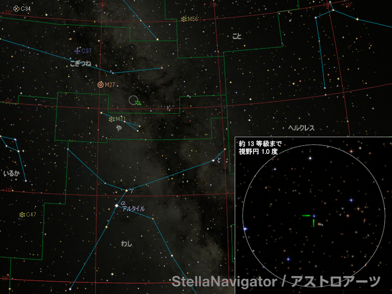 新星の明るさは7月30日時点でおよそ9等台なかばを推移しています。位置はこぎつね座とや座の境界付近で、近くにあれい星雲M27やコートハンガー(アステリズム)、球状星団M71などがある観望や写真撮影の人気のスポットです。ぜひ多くの皆さんの観測をお願いします。