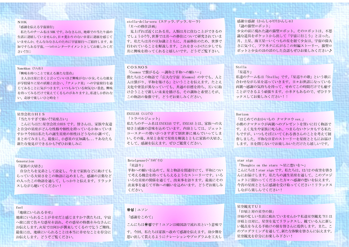 さらに教育文化センターの先生からは、「『星空プログラミング』の学びで大切なことは相手意識。自分の思いを伝えることだけでなく、相手も自分も幸せになれる作品にしていくことの大切さ」を繰り返し具体的に支援いただきました。気がつくと生徒たちは、ステラドームスクールを旧知の機器のように駆使できるようになりました。