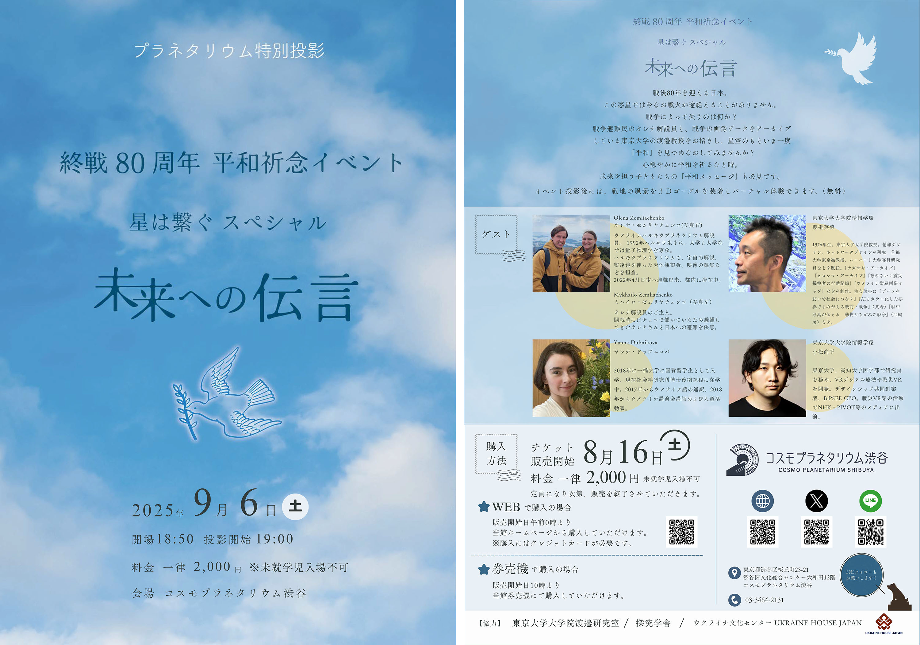 戦後80年ということで、さまざまなイベントや番組が作られています。コスモプラネタリウム渋谷(東京都)では9月6日(土)、終戦80周年 平和祈念イベントが実施されます。特別投影「未来への伝言」は、2023年、2024年に投影された「星は繋ぐ」のスペシャルバージョン。前半はウクライナハルキウプラネタリウムのオレナ解説員とご主人のミハイロさんが、開戦直後から祖国を後にして日本で生きるすべを模索し奮闘した3年間の足跡をたどります。後半では、戦争や自然災害の画像および映像のアーカイブ化、AIを用いた戦時中の写真のカラー化に携わる東京大学の渡邉英徳教授が登場。今現在戦火にさらされている地域、さらに80数年前の日本の様子をドームならではの迫力の映像で見ながら、戦争と平和についてお話されます。日本語とウクライナ語のバイリンガル投影で行われるとのことです。