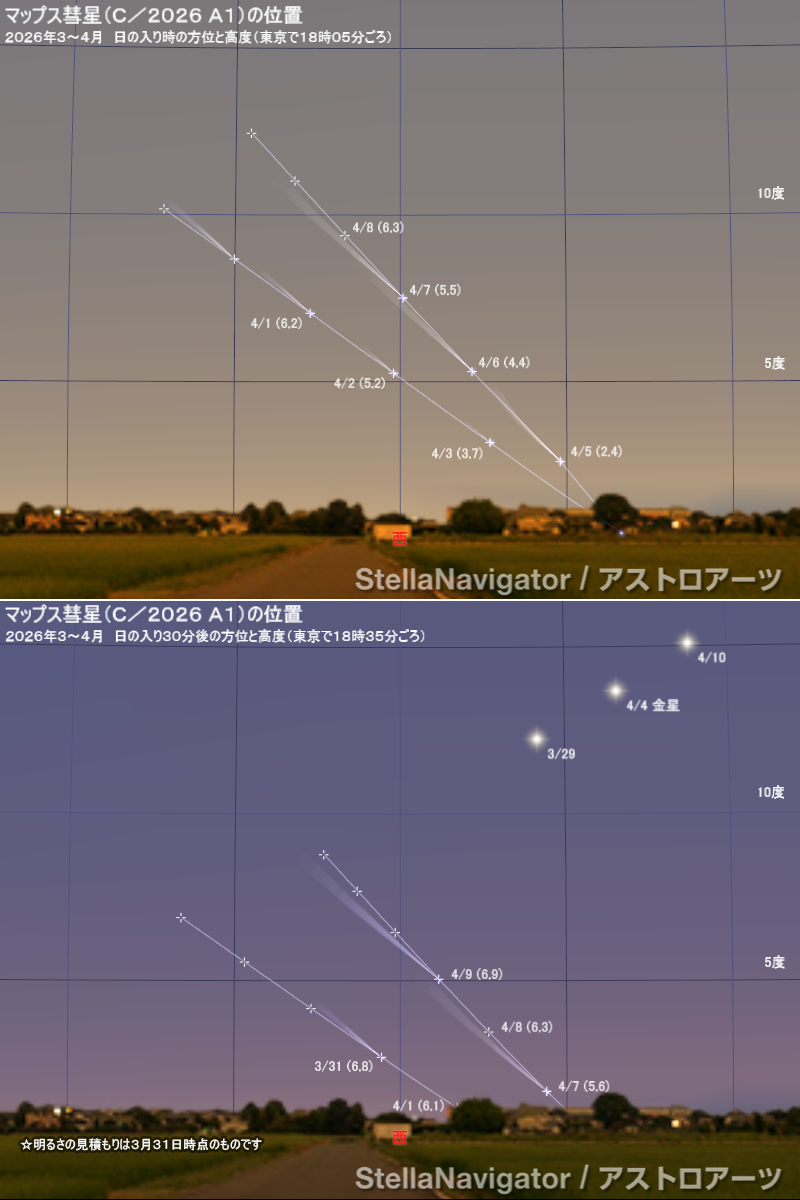 3月末から4月初めごろ、マップス彗星(C/2026 A1; MAPS)が0等級前後まで明るくなるかもしれない。