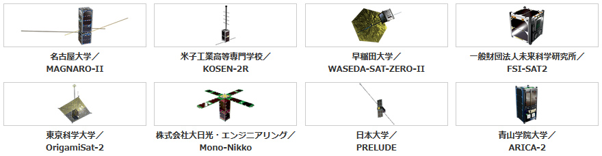 - ■ 8機のキューブサット(名称、開発元、テーマ)