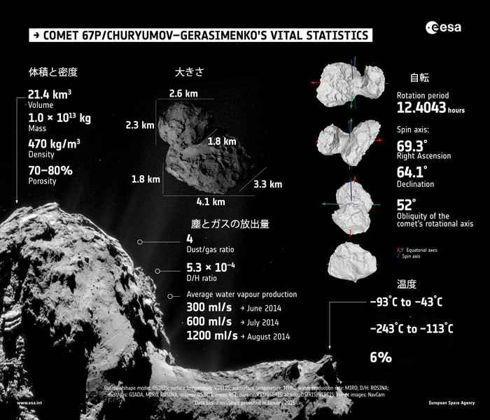 2014年8月からチュリュモフ・ゲラシメンコ彗星(67P:以降CG彗星)を追跡しながら観測を行っている欧州探査機「ロゼッタ」により、彗星の物理的な性質や彗星活動を物語る地表のようすなど、多くのことが明らかになってきた。