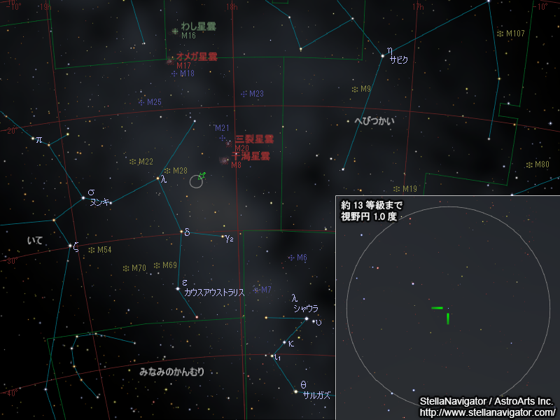 この天体を天文シミュレーションソフトウェア「ステラナビゲータ」で表示して位置を確認できます。まず「ツール」メニュー→「データ更新」で新天体データを取得してから、「いて座新星2015(2015)」を検索・表示してください。