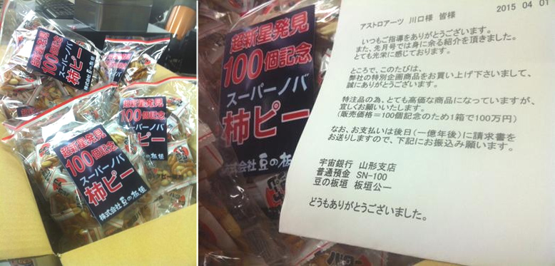 エイプリルフール2日前に板垣さんのご快諾を得て本記事を公開したところ、当日午後に板垣さんから本物の「スーパーノバ柿ピー」がサプライズで届きました。