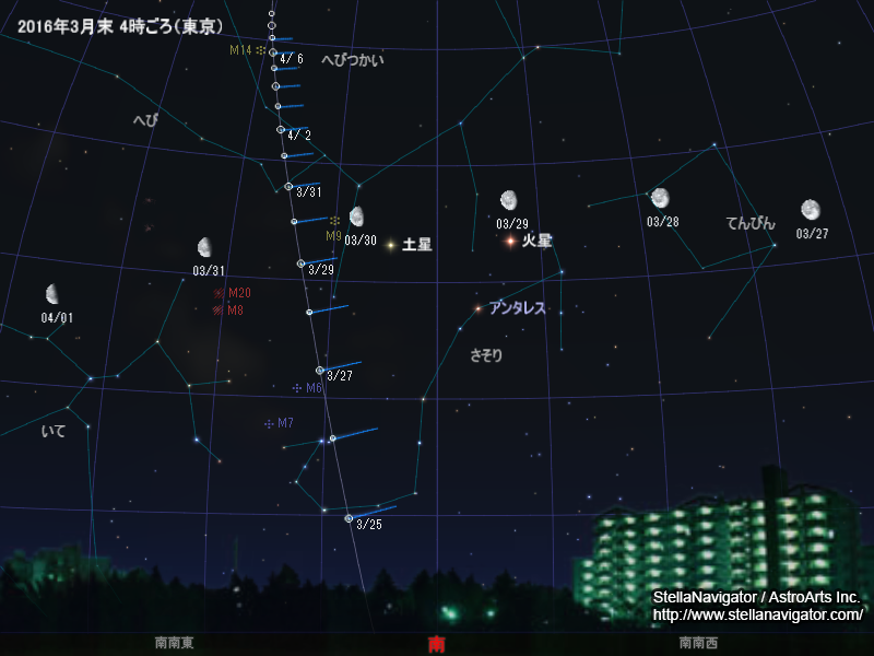 朝4時ごろの見え方。彗星は模式的に表現している。3月27日に散開星団M6、30日に球状星団M9と接近し、4月6日ごろにM14と大接近する。クリックで拡大