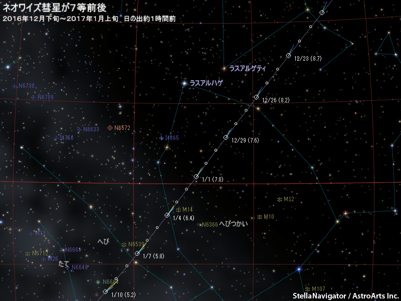 2016年12月下旬から2017年1月上旬、明け方の東の低空にネオワイズ彗星(C/2016 U1)が見えている。1月14日の近日点通過に向け明るくなっており、6~7等まで達すれば双眼鏡で見えるかもしれない。日の出1時間前(東京で5時50分ごろ)の高度が10度前後とかなり低いが、見晴らしの良いところで見たり撮ったりしてみよう。