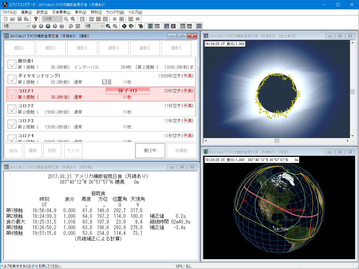 日食の影が移動していく地図表示、正確な時刻を表示する時刻表やCGシミュレーション画面に加え、撮影の進行状況を表示する撮影ウィンドウを表示。クリックで画像拡大