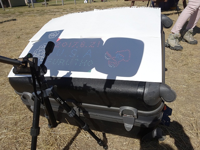 (1枚目)観測の様子。(2枚目)ピンホールで欠けた太陽を投影。クリックで画像拡大(撮影:アストロアーツ 泉水朋寛、ドリッグスにて)