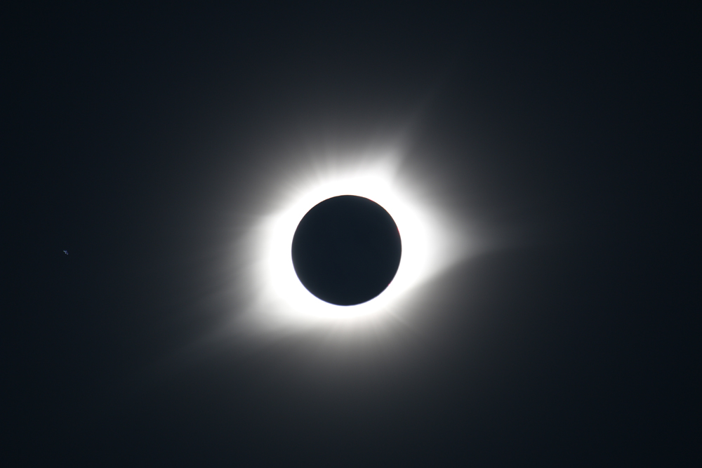 皆既食。太陽左下の光点はしし座のレグルスで、皆既中は双眼鏡でコロナとともにはっきりと見えていた(撮影:アストロアーツ 川口雅也(ティトンビレッジにて)+上田敬司(ドリッグスにて))