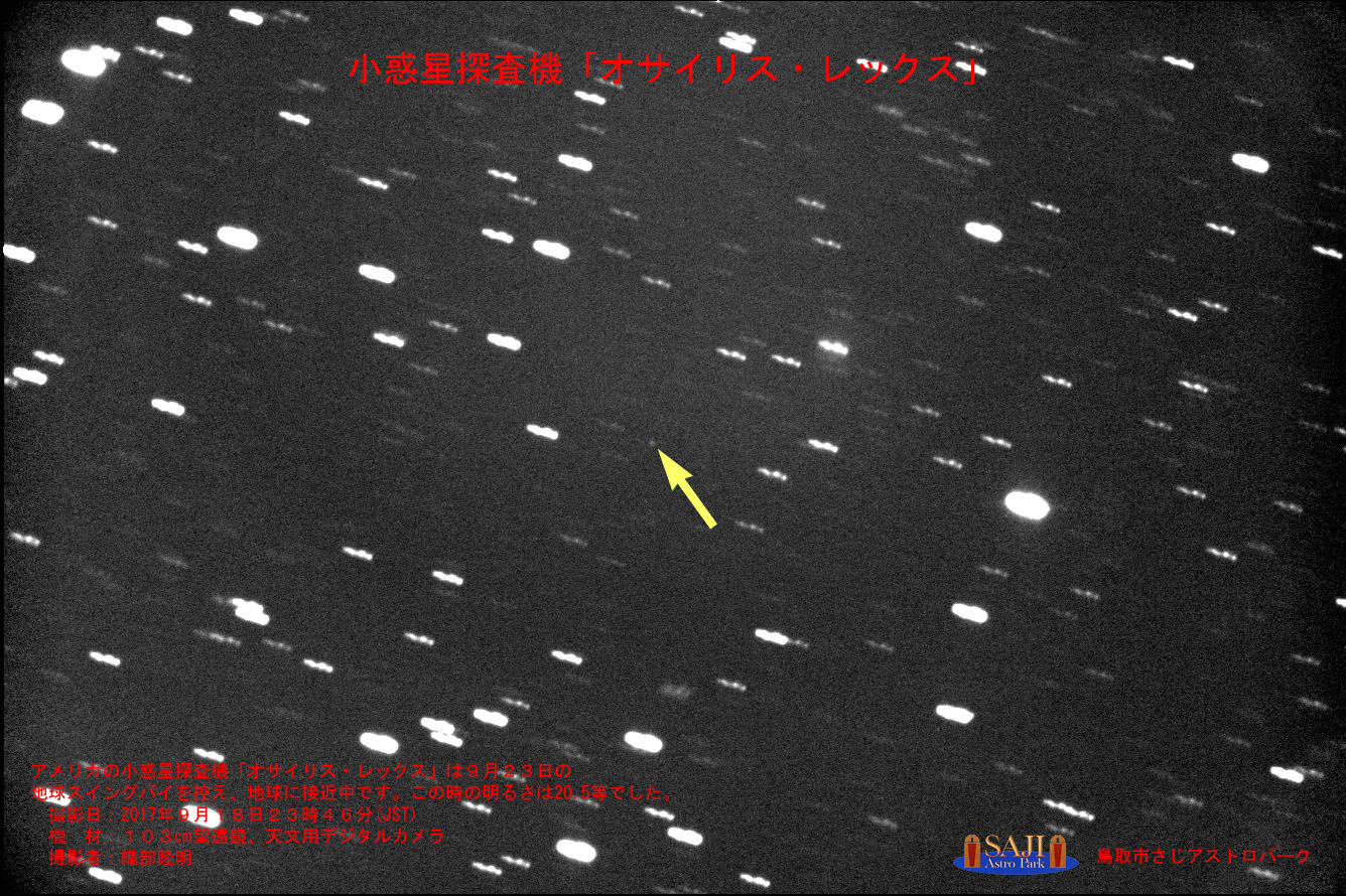 鳥取市さじアストロパークの口径103cm反射望遠鏡(愛称:キラット望遠鏡)が9月18日夜、スイングバイに向け地球に接近しつつあるオシリス・レックスの姿を撮影することに成功した。撮影時の探査機までの距離は約224万km(月までの平均距離の約6倍)で、明るさは20.5等(1等星の約6300万分の1)だった。さじアストロパークによれば、同探査機の撮影はこれが日本初と思われるとのことだ。