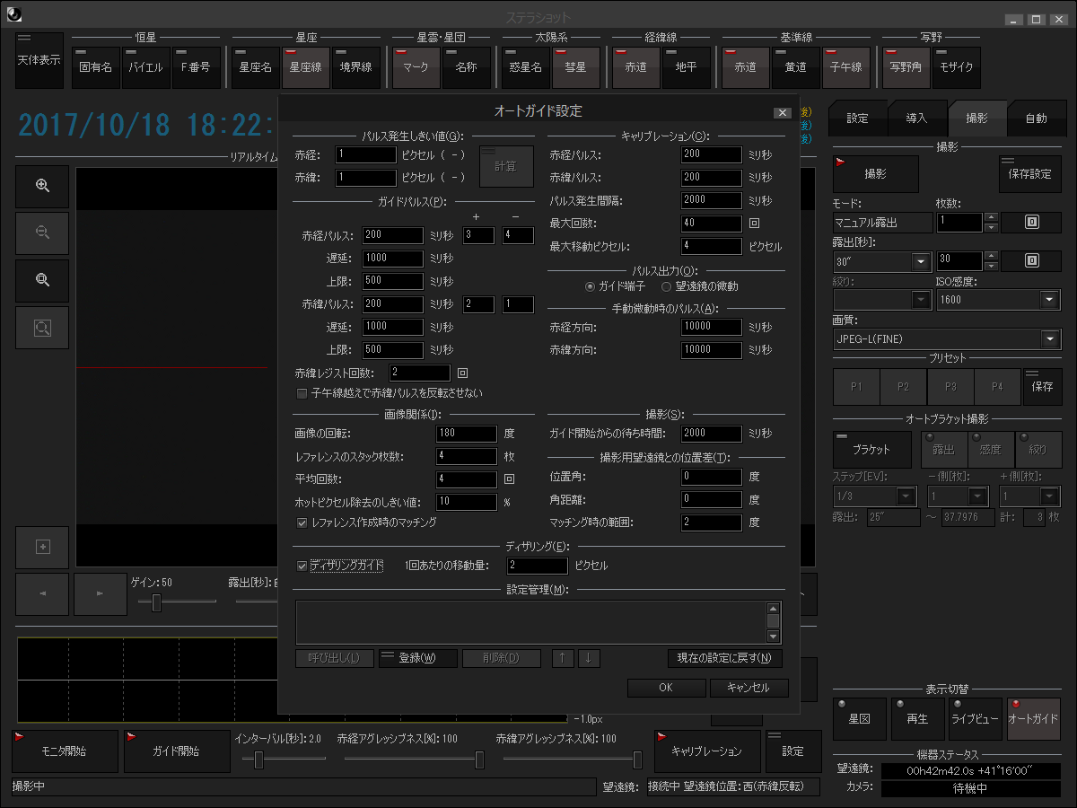 ディザリング撮影に対応したオートガイドの設定画面。1回あたりの移動量で、オートガイダー上でずらすピクセル数を設定できる。クリックで画像拡大