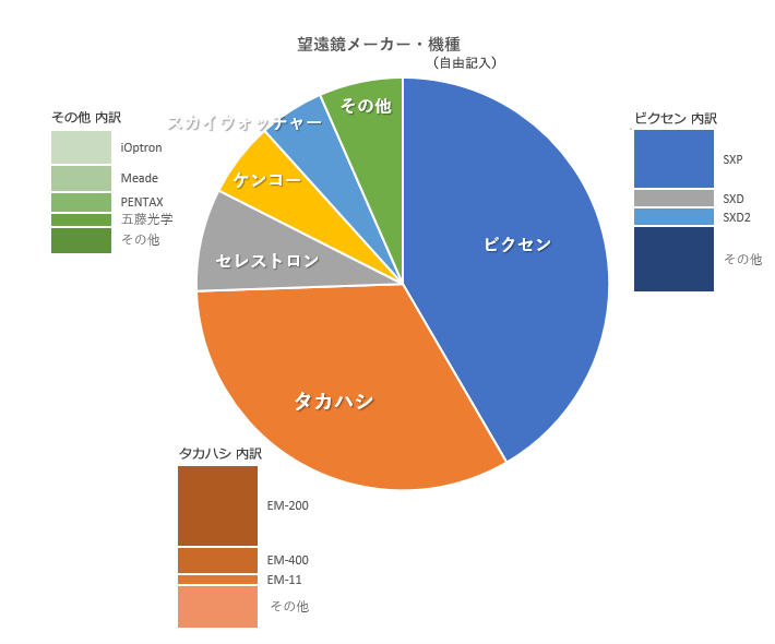 赤道儀のメーカーは、ビクセンとタカハシが圧倒的に多く、この2社で全体の3分の2を占めます。ビクセン製の赤道儀ではSXPが最も多く、同じく中型機のSXDやSXD2が続いています。タカハシ製赤道儀は大半が中型機のEM-200であり、大型機のEM-400がそれに続きます。比較的新しい機種が多い点については、前述の撮影歴の統計と照らし合わせると納得できそうです。なお、少数ですが往年の五藤光学製のマークXを使っているという方もいたのが目を引きます。