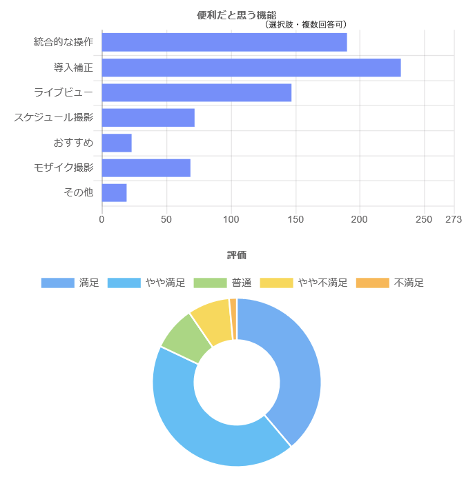 「総合的な操作」、「導入補正」、「ライブビュー」を特に便利と感じた回答が多く、ほとんどの方が「満足」、または「やや満足」との回答をいただいています。全体的には、撮影の手間が省けることが、大きく評価されていることがうかがえます。