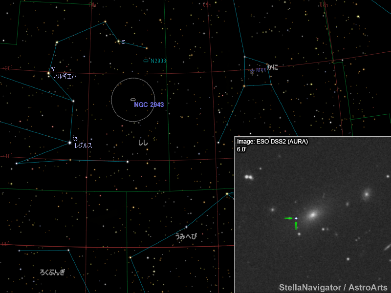 NGC 2943周辺の星図と、DSS画像に表示した超新星。画像クリックで星図拡大(「ステラナビゲータ」で星図作成。DSS画像の版権について)