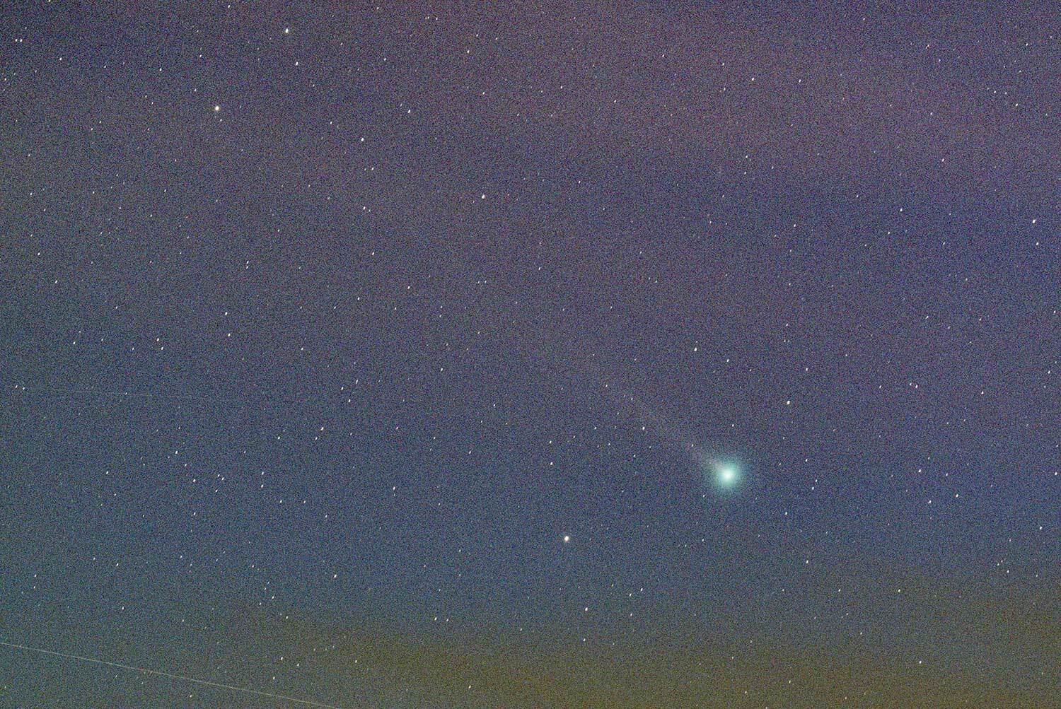 日中から久しぶりの快晴だったので阿蘇草千里西駐車場へ。低空の筋雲とモヤは変わらず邪魔をしましたが、ようやく明瞭に尾が写りました。画像で約50分写っています。頭部の形は横につぶれてC/2021A1のようです。20秒露出4枚から強調、トリミングはしていません。