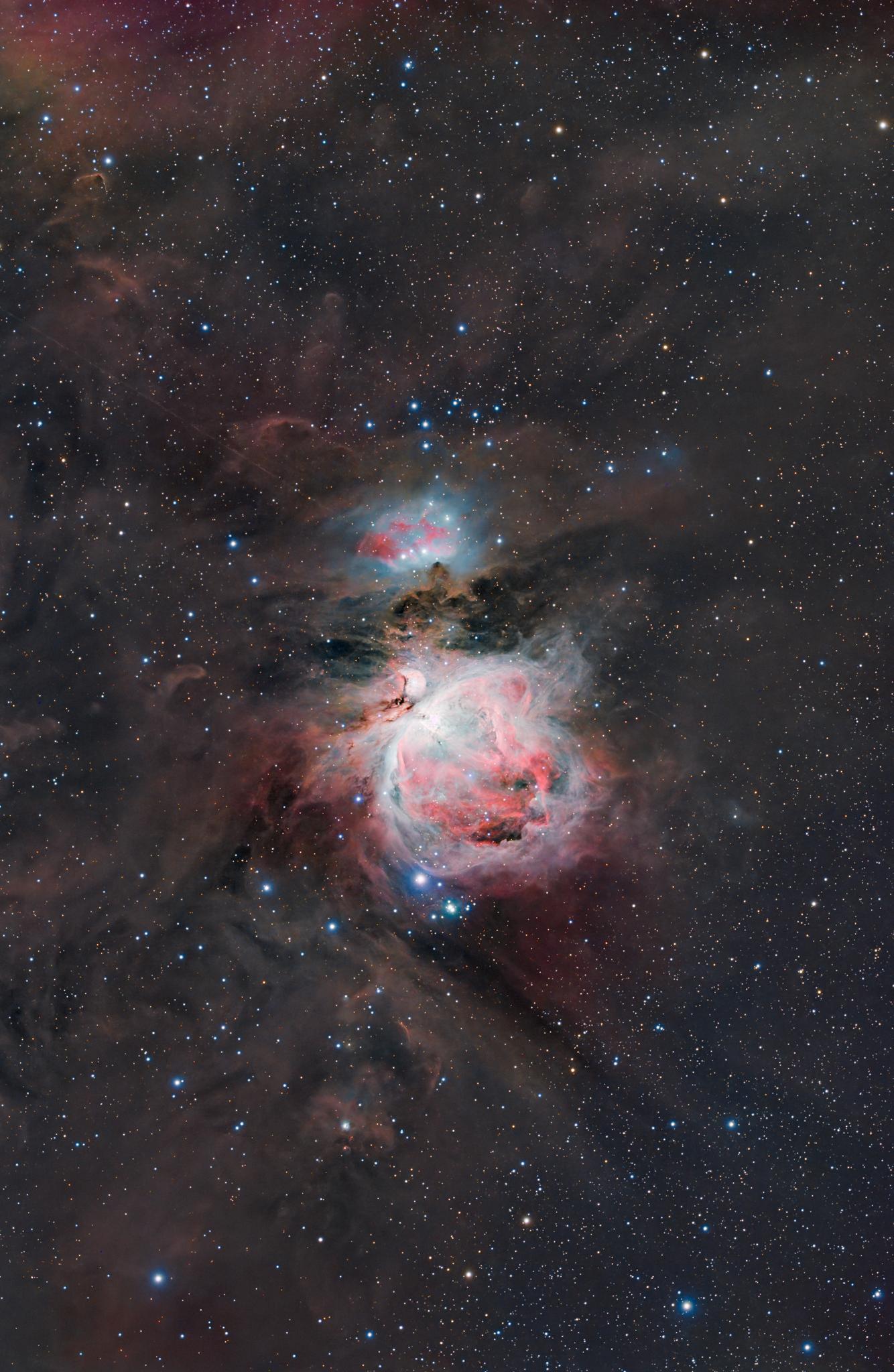 自宅庭からオリオン大星雲を撮影(3分×34枚)しました。 FRA400×0.7倍レデューサ(FL280mm)でカラー、SQA55(FL264mm)でモノクロ撮影し、LRGB合成しました。