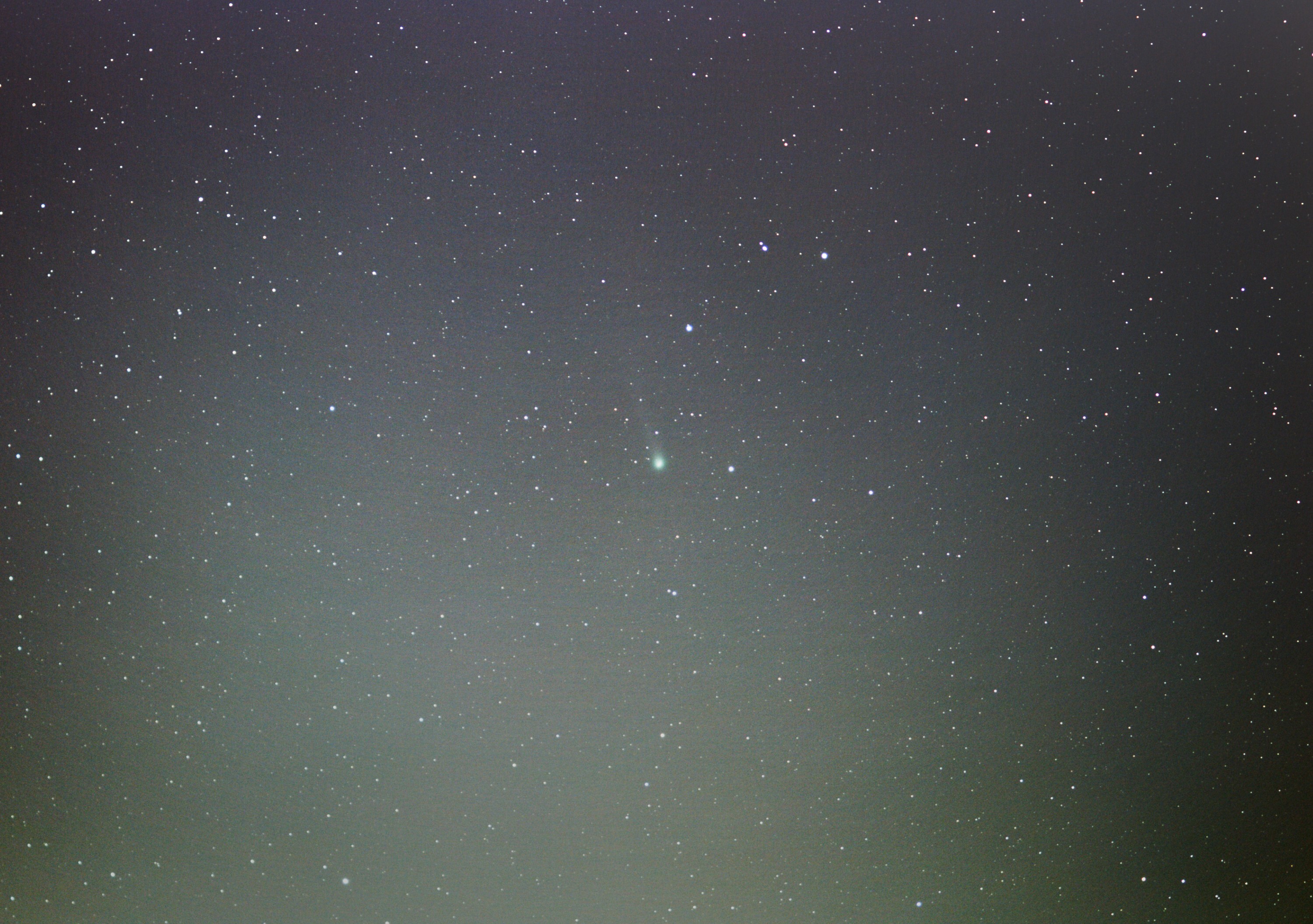 04:04-04:23に撮影の画像を加算合成しました。 自動導入の経緯台による追尾撮影です。写野の回転による周辺の黒ぶちを若干トリミングしました。 肉眼だと星が皆無の、みなとみらい方面の光害の海の中からようやく昇ってきた彗星像です。