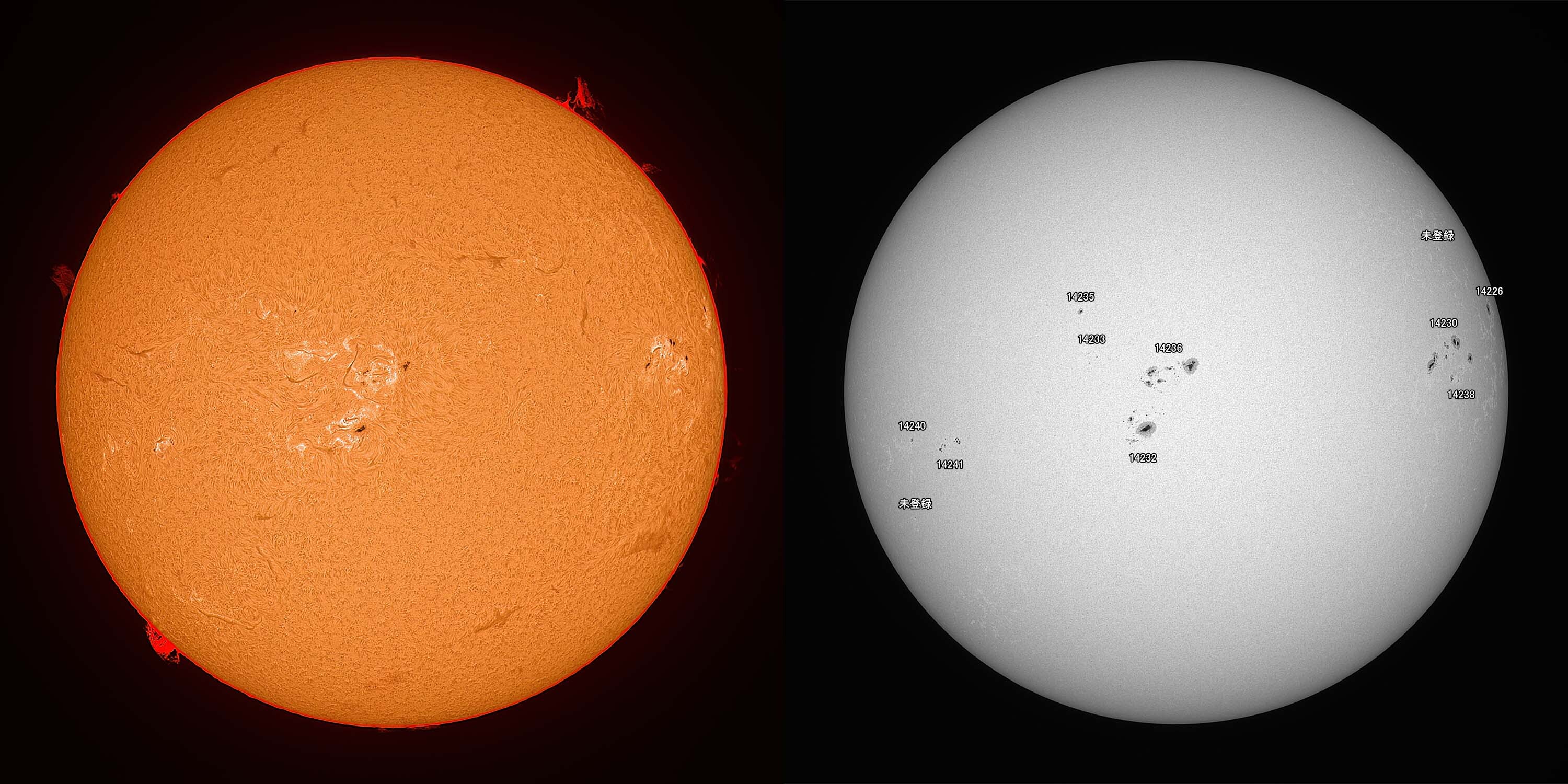 光球面:FireCapture、ROI 3600x2400、Gain 100、1.75msec x1000、撮影時間 31秒/プロミネンス:FireCapture、ROI 3600x2400、Gain 300、1.75msec x1000、撮影時間 31秒