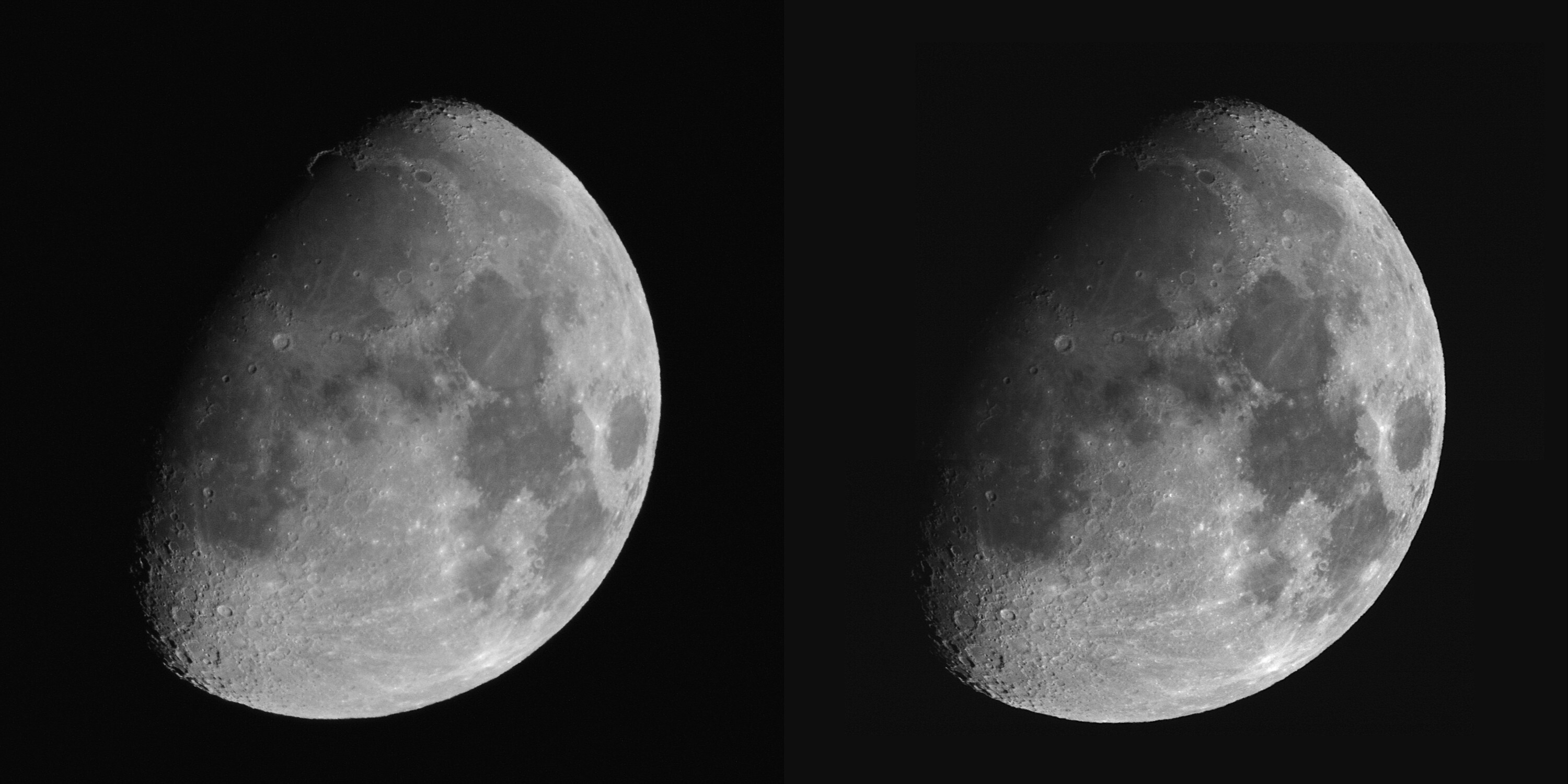 左側は望遠鏡でそのまま直焦点撮影したもの、右は二倍バローレンズで直焦点撮影したものを手動モザイク合成したもの。