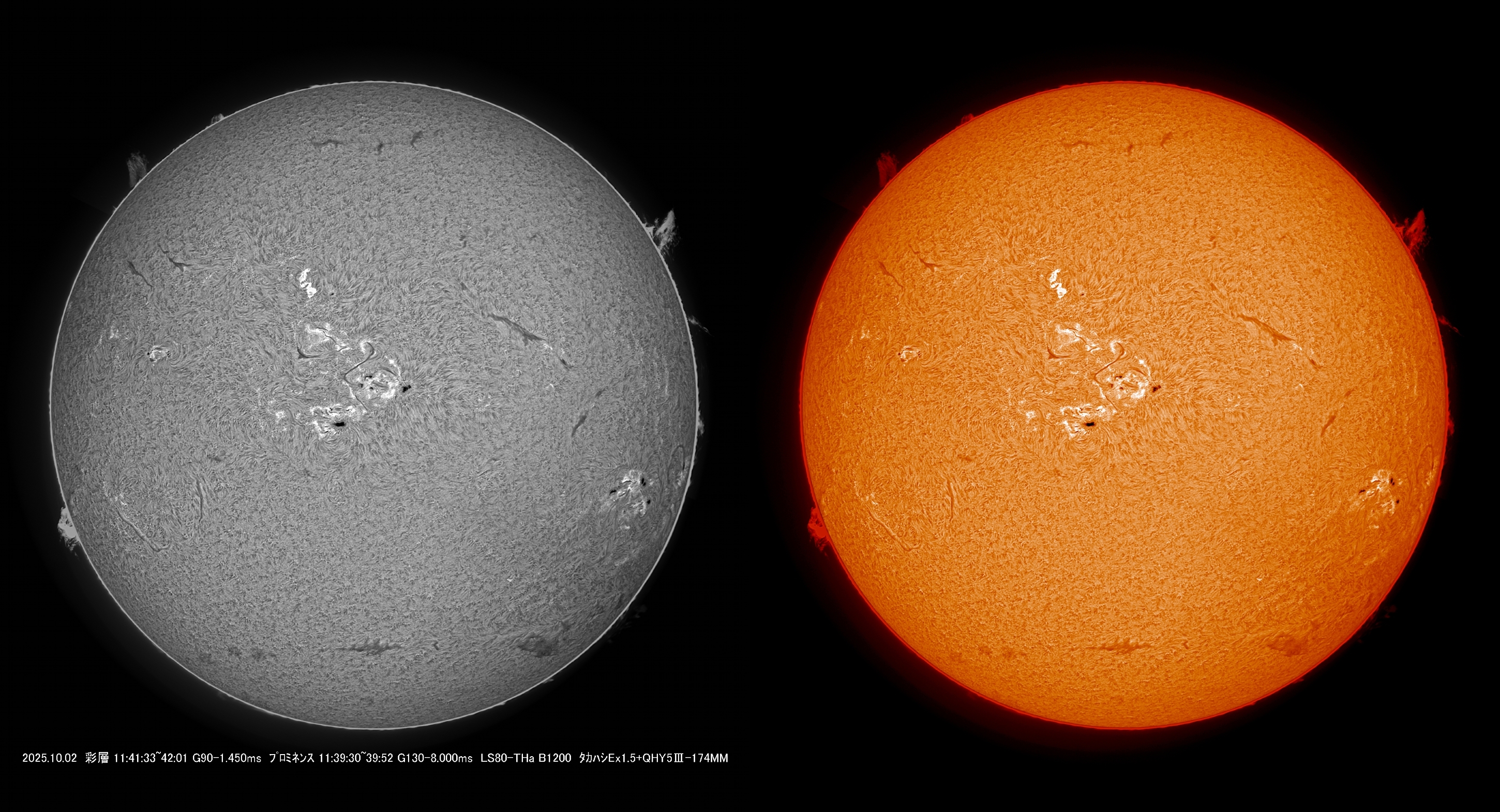 光球面とプロミネンスを2分割で個別に撮影して合成・擬似カラー化。予報に反して雲が多く雲間が数秒程度で何度も撮り直し、やっと全面画像のみ撮影でき・・・疲れました。