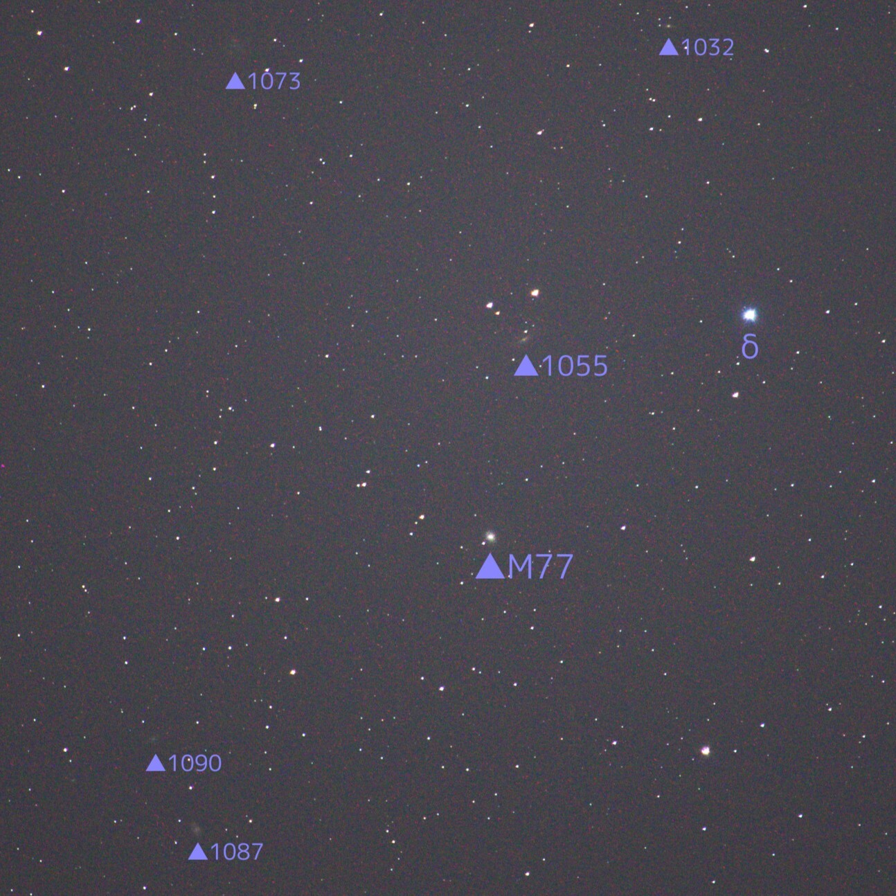 一般的に銀河は淡く、多くは撮影の際に長時間露出が必要ですが、このM77は中心部がとても明るく、りょうけん座のM94同様、低倍率(短焦点)では恒星と見間違えそうです。
