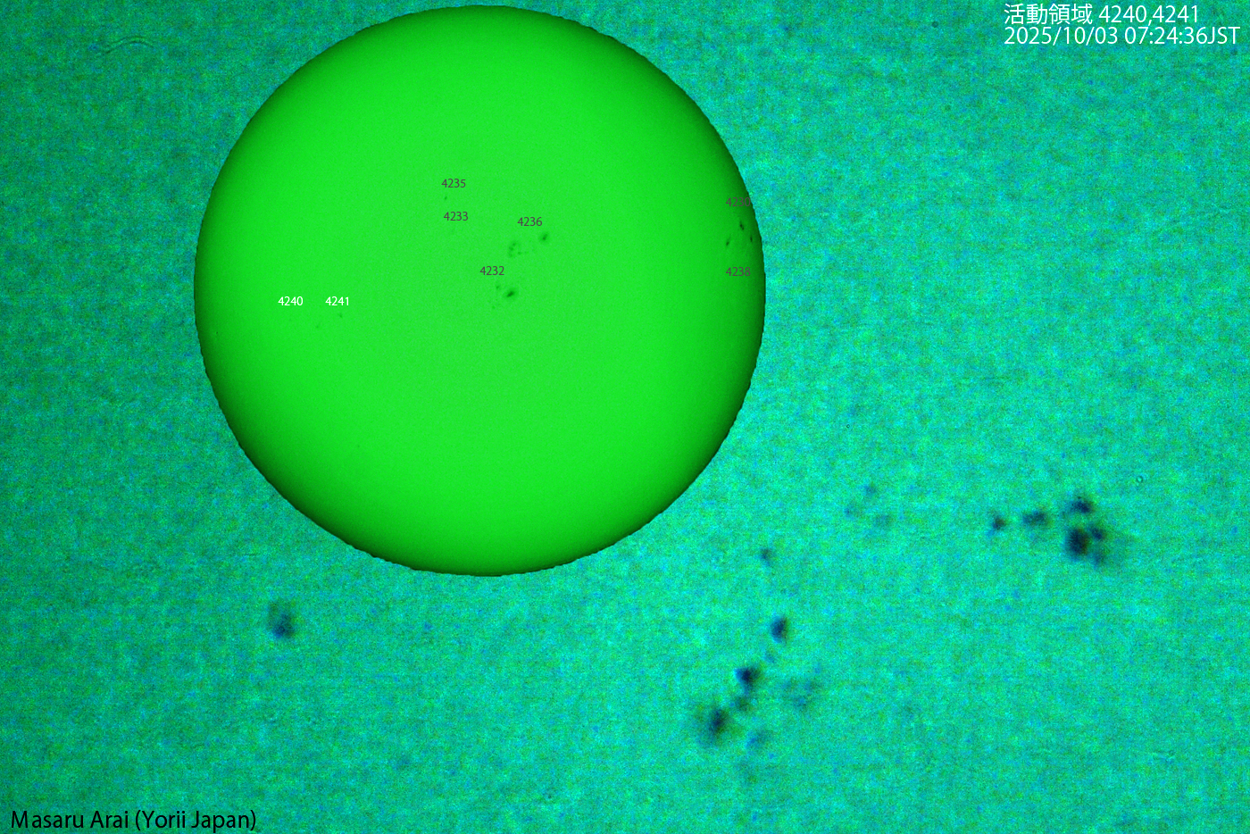 SE120L+DMC-GH1よる、活動領域 4240 ( Axx/Axx ) 4241 ( Dro/Cro ) です。 NICT情報:活動領域4236で、3日14時23分JSTにM1.5/2Nフレアが発生しました。