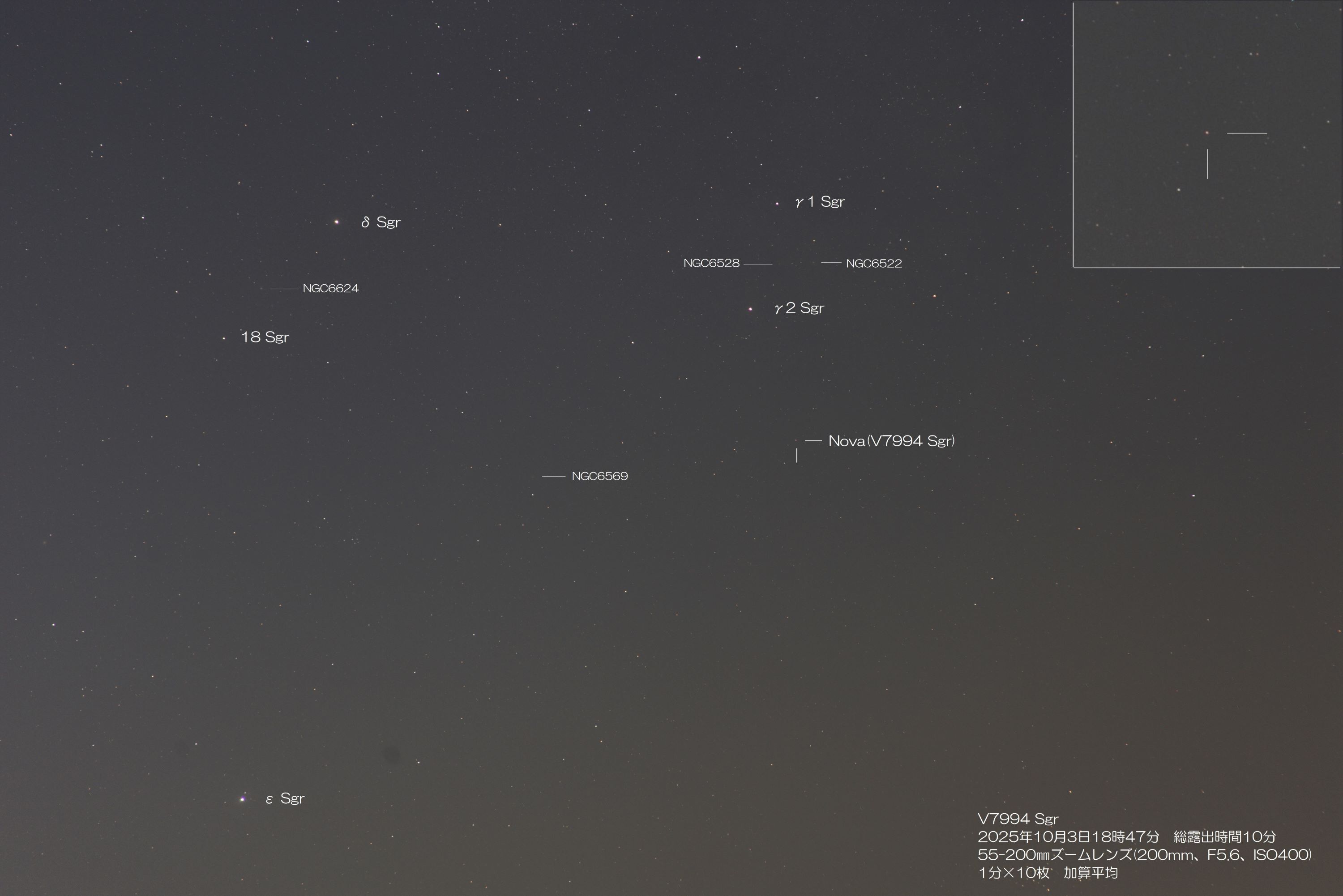 天候に阻まれなかなか撮影できなかったいて座新星をやっと撮影できました。 強烈な月明かりの中でしたが、近くの星と比べると8等級程度の明るさで何とか写りました。