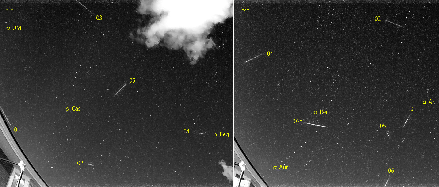 1)18:41から約2.5時間の5コマを、2)22:09から約2時間の6コマを処理しました。 出現した順に数字と記号を始点付近に記入。tは痕traceあり。 群流星が見あたらなくなりました。