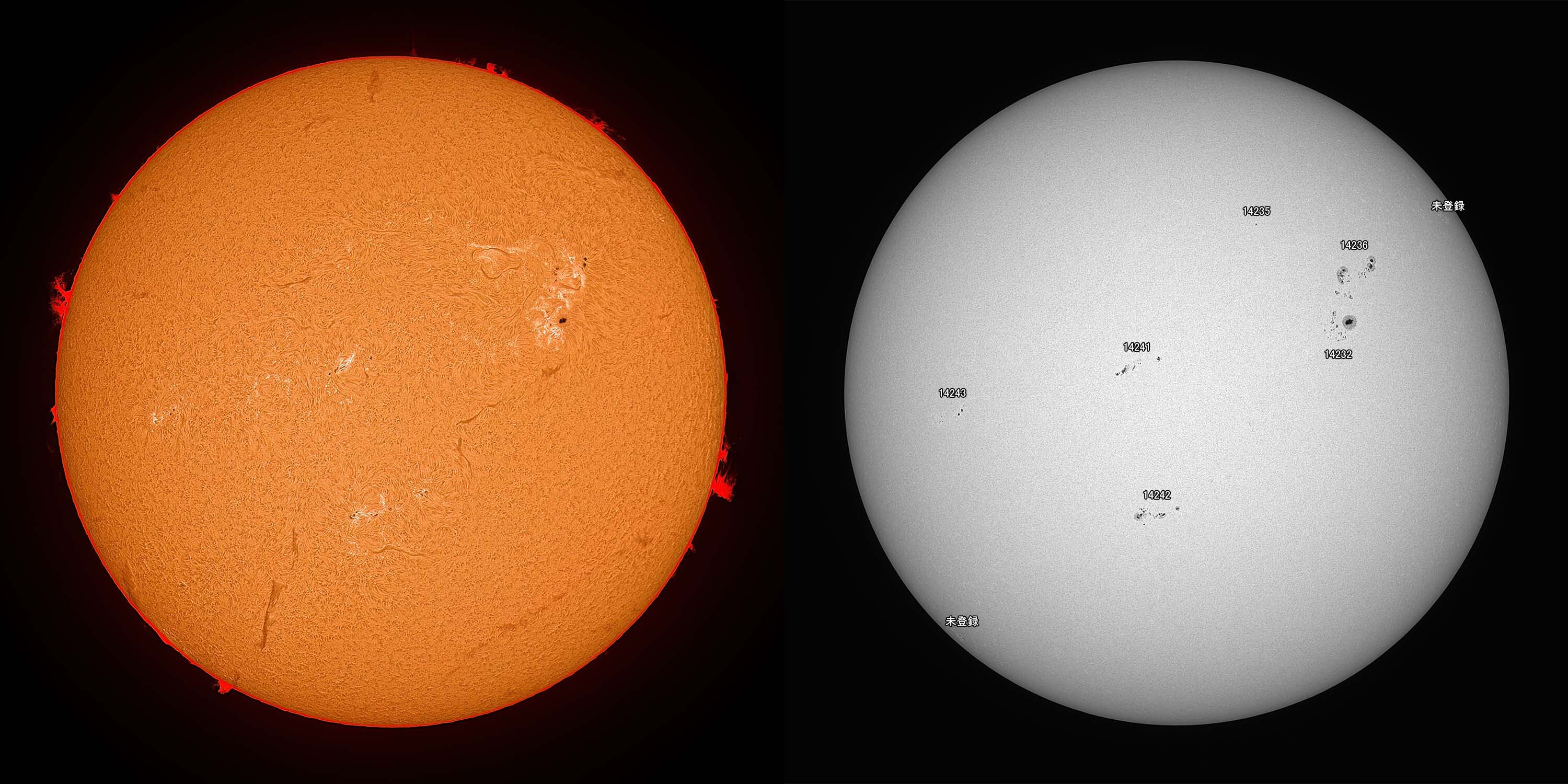 光球面:FireCapture、ROI 3600x2400、Gain 100、1.85msec x1000、撮影時間 31秒/プロミネンス:FireCapture、ROI 3600x2400、Gain 300、1.85msec x1000、撮影時間 31秒