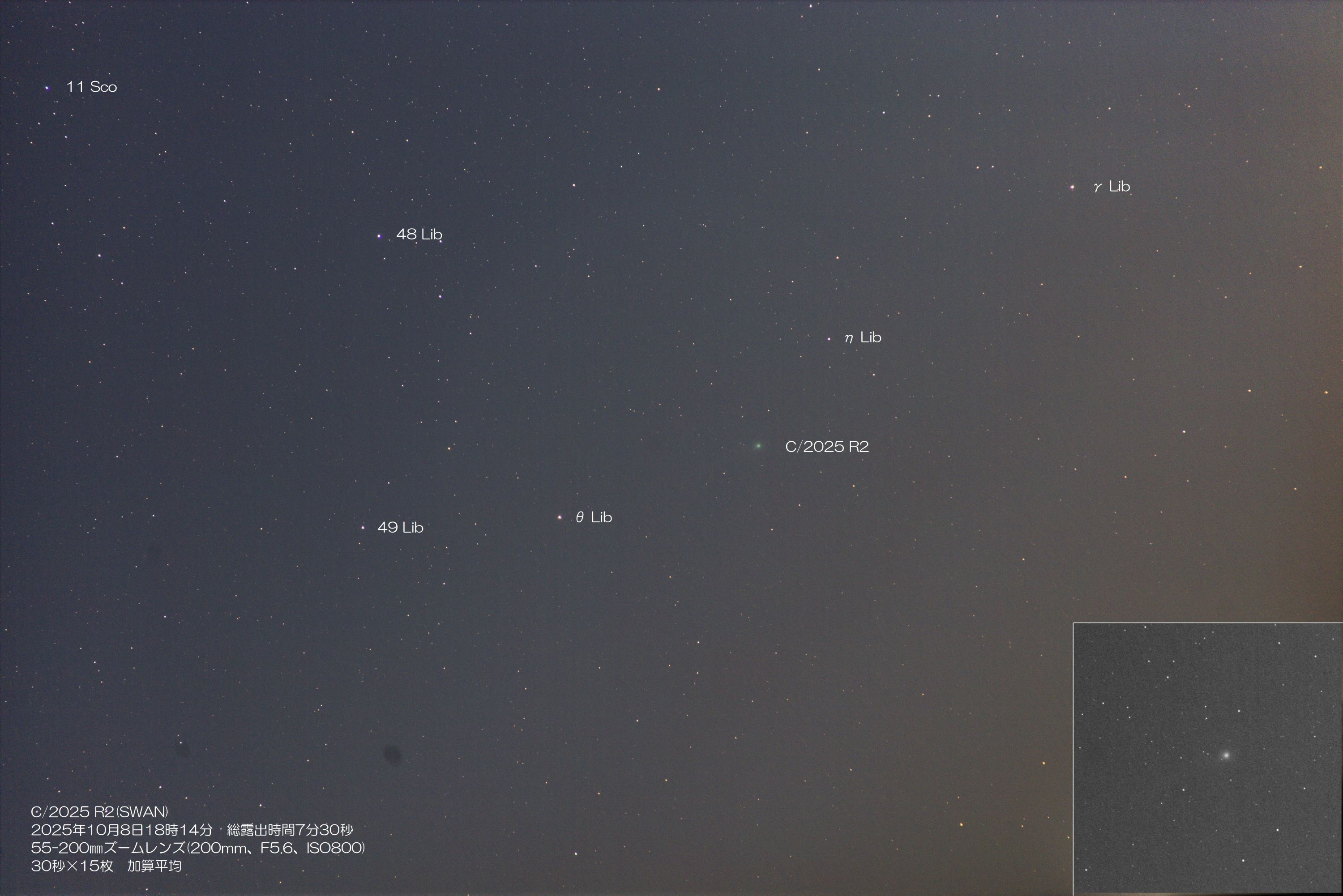 10月8日のSWAN彗星です。 撮影開始時の彗星高度は7度と低いものの、なんとか淡い尾を写すことができました。 右下のトリミング画像は、尾が見やすいように強調処理した黒白画像ですが、左側少し斜め下に向かって真っすぐに伸びる淡い尾が見えます。 5cm7倍双眼鏡でもにじんだ星のように微かに見ることができました。