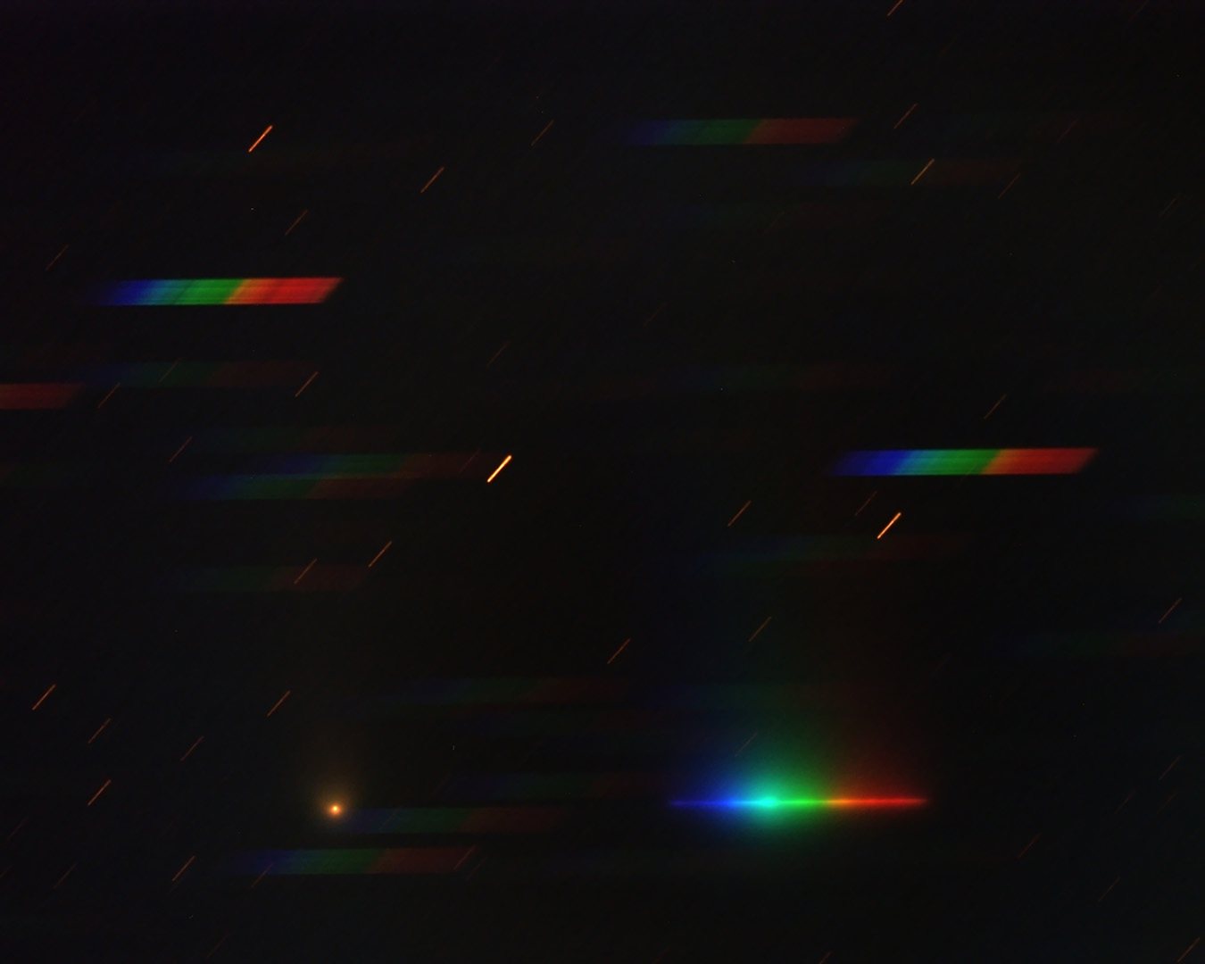 Shelyak社のスターアナライザー100(100lines/1mm)の回折格子を使用して分光したLEMMON彗星のスペクトルです。画面左下に見えるオレンジ色のボヤっとした部分が彗星の核の0次スペクトル。その右側に見えるボヤっとした七色の線が核の1次スペクトルになります。僅かにガスの尾が画面上に向かって伸びているのですが、あまり目立ちません。今後、より明るく、ガスの尾も明瞭になってくれれば、ダストの尾の連続スペクトルとガスの尾の輝線スペクトルが明瞭に分離してみられることでしょう。期待しています。 露出17分、彗星の核でコンポジット。