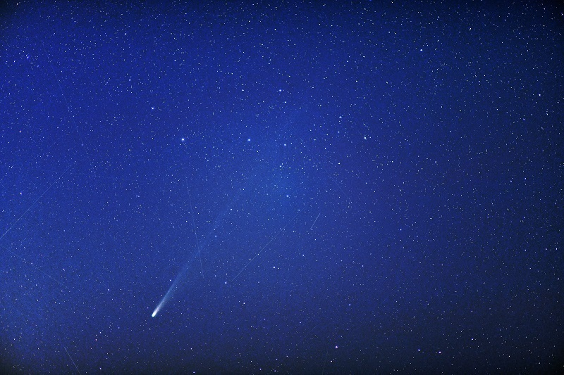 少し暗い場所へ移動して撮影しましたが、薄雲や水蒸気の多い空に阻まれてしまいました。この画像でも彗星の尾が薄いながらも15度を超えています。